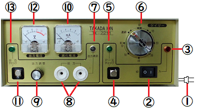 ⑧出力端子 ⑨ 出力調整つまみ ⑩ 漏れ電流計 ⑪ 出力チェックプレート ⑫ 出力電圧計 ⑬ 出力チェックランプ